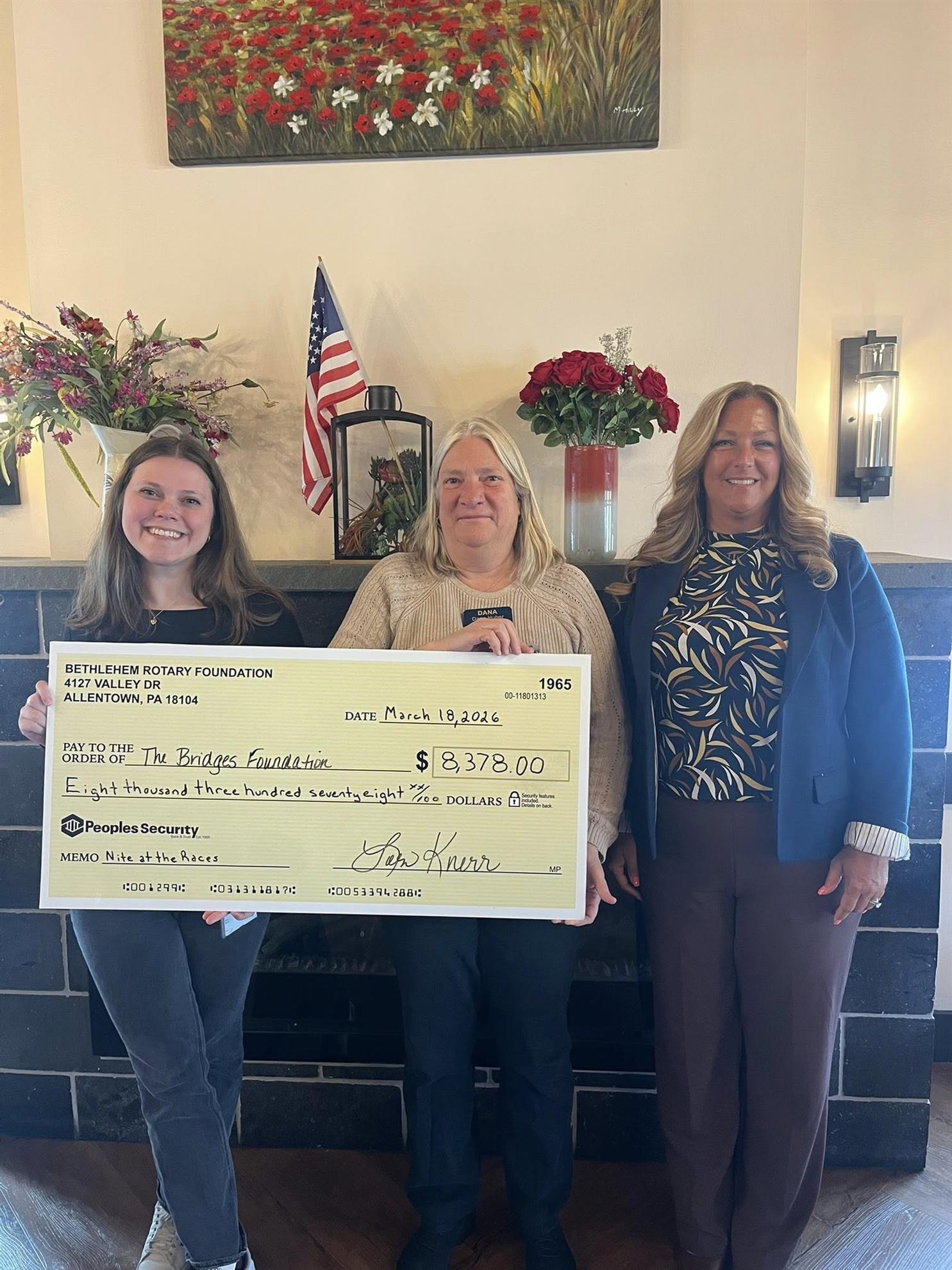At our meeting on March 18 we presented a check to The Bridges Foundation-BAVTS for their partnership with us at our annual Nite at the Races! We are happy to be able to support such a meaningful organization and their mission of supporting BAVTS students and investing in the workforce of the future.